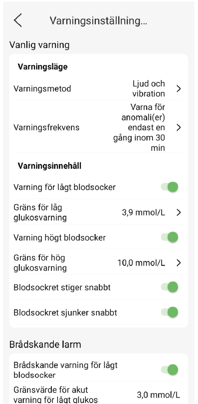 Ställ in individuella gränser för glukosvärden - du kommer att varnas av ljud och/eller vibrationer om gränserna överskrids eller inte nås. Målområdet på startskärmen bestäms av de gränser som ställts in för värden som är för höga eller för låga. Du kommer också att få en varning om sändarsignalen försvinner. Den maximala överföringsräckvidden är 2 meter. Om du tappar sändarsignalen överförs data automatiskt så snart anslutningen återupprättats.
