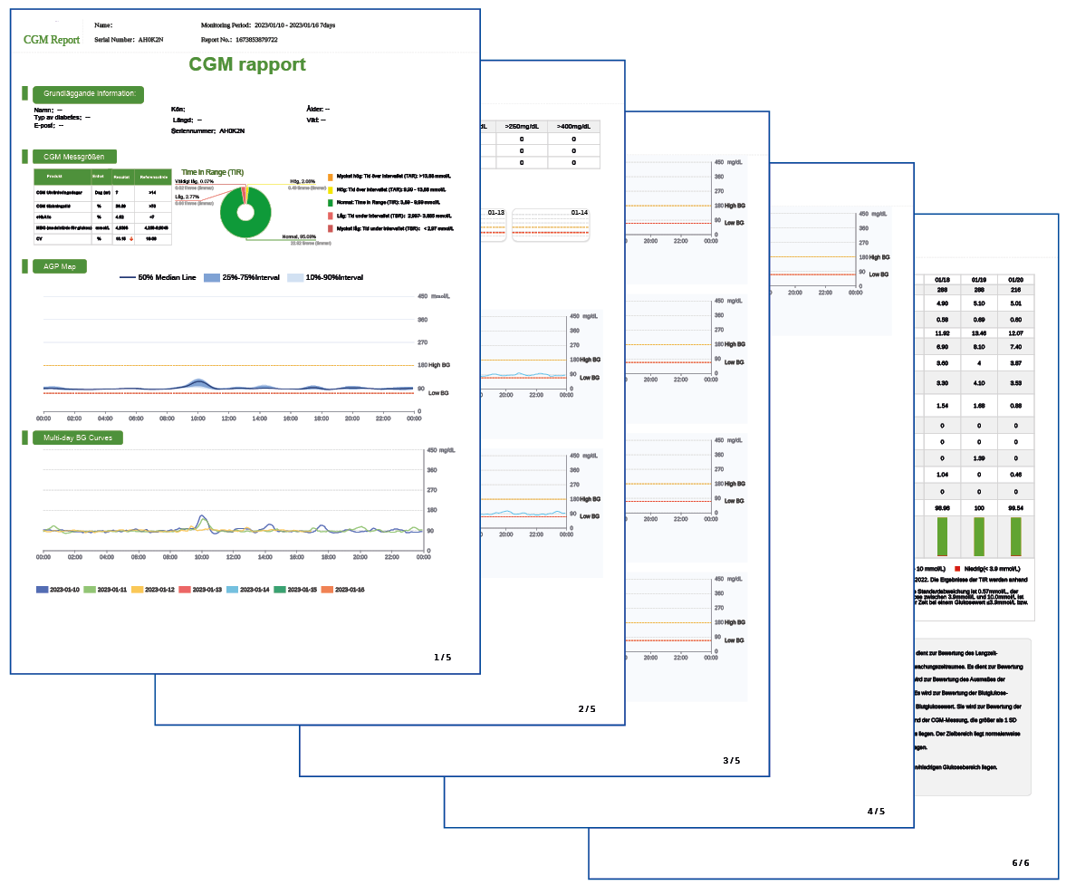 I appen kan du generera en CGM-rapport som en PDF som innehåller en strukturerad och grafisk representation av dina sensordata (inklusive din ambulatoriska glukosprofil - AGP, tiden i målområdet TIR, eHbA1c och många andra parametrar). Du kan skicka rapporten direkt med hjälp av delningsfunktionen på din smartphone, t.ex. till din läkare eller annan valfri mottagare. Se en komplett rapport som exempel här.