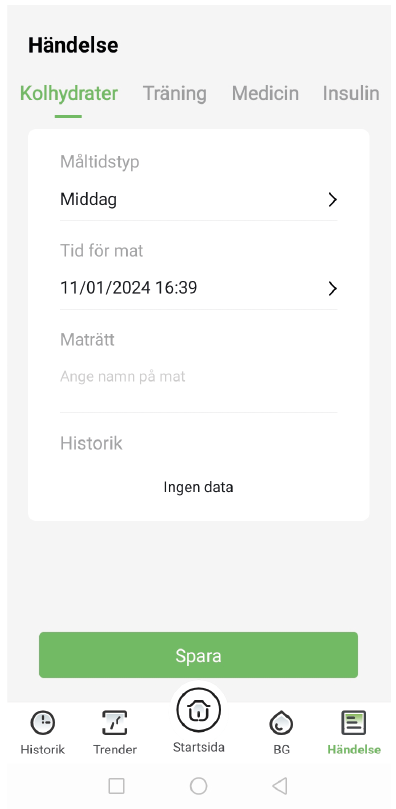 Du kan välja att registrera olika händelser, exempel: Måltid, insulin, medicin eller träning/ aktivitet. Dessa markörer ingår inte i några beräkningar, de används endast för att komplettera de uppmätta värdena.