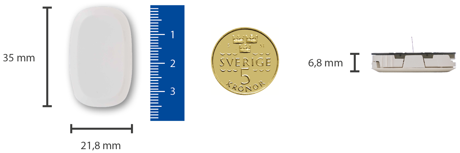 Tack vare sin lilla och platta design kan Wellion SENSOR bäras mycket diskret. Den är ungefär lika stort som en 5-krona.