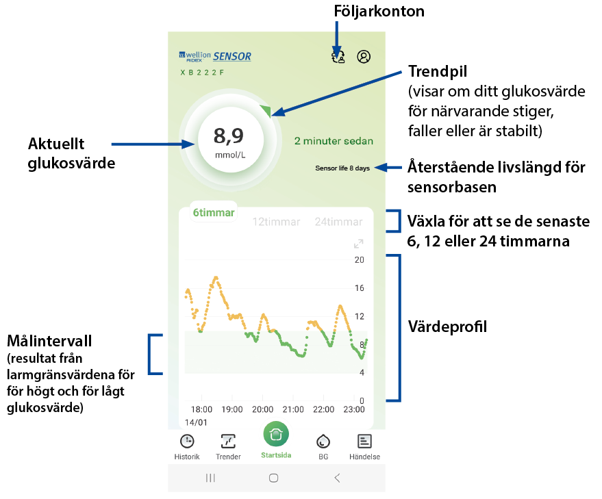 Använd bakgrundsfärgen på din startskärm för att se om ditt nuvarande värde ligger inom målintervallet eller under/över det. Om ditt nuvarande värde ligger inom målintervallet visas startskärmen med en grön bakgrund. Om ditt värde är för högt är startskärmen markerad i orange. Om värdet är för lågt visas det i rött. Om du använder appen i mörkt läge visas cirkeln runt det aktuella glukosvärdet och trendpilarna i färgerna grön, orange eller röd. Dessutom visas värdena i värdekurvan i färg så snart de ligger utanför målområdet.