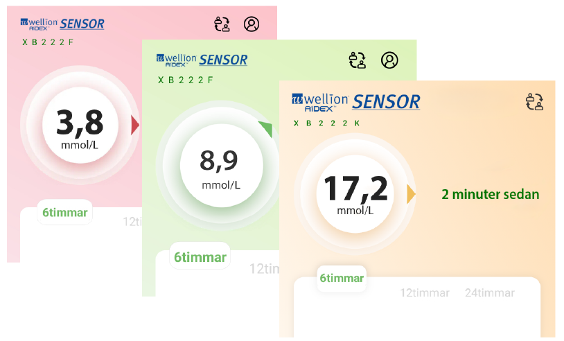 3. Wellion AiDEX SENSOR App: tar emot de uppmätta värdena och visar dem tydligt (t.ex. aktuellt värde, trendpilar, målområde, larm, rapporter, ...). Appen är tillgänglig för Android och iOS.