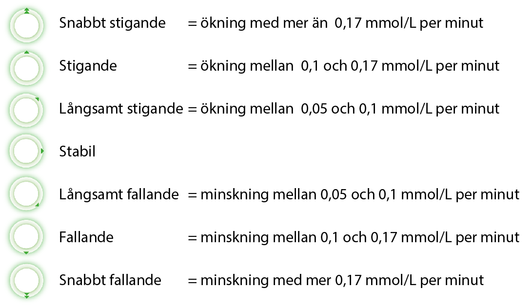 Trendpilarna visar din nuvarande glukostrend, t.ex. om ditt värde är stabilt eller hur snabbt det stiger eller faller. Detta gör att du tidigare kan känna igen hur din glukoskurva utvecklas och att vid behov vidta motåtgärder. Detta kan hjälpa dig att hålla dig bättre inom ditt målområde.