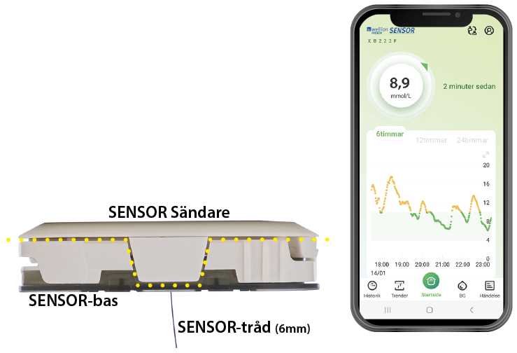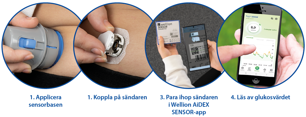 Wellion SENSOR-sändaren är ansluten till Wellion SENSOR-basen. Denna används för dataöverföring och är kopplad till Wellion AiDEX SENSOR-app. Efter uppvärmningstiden (1 timme) kan du se ditt glukosvärde i Wellion AiDEX SENSOR-app i "realtid". Wellion SENSOR är förkalibrerad, så kalibrering är inte nödvändig.